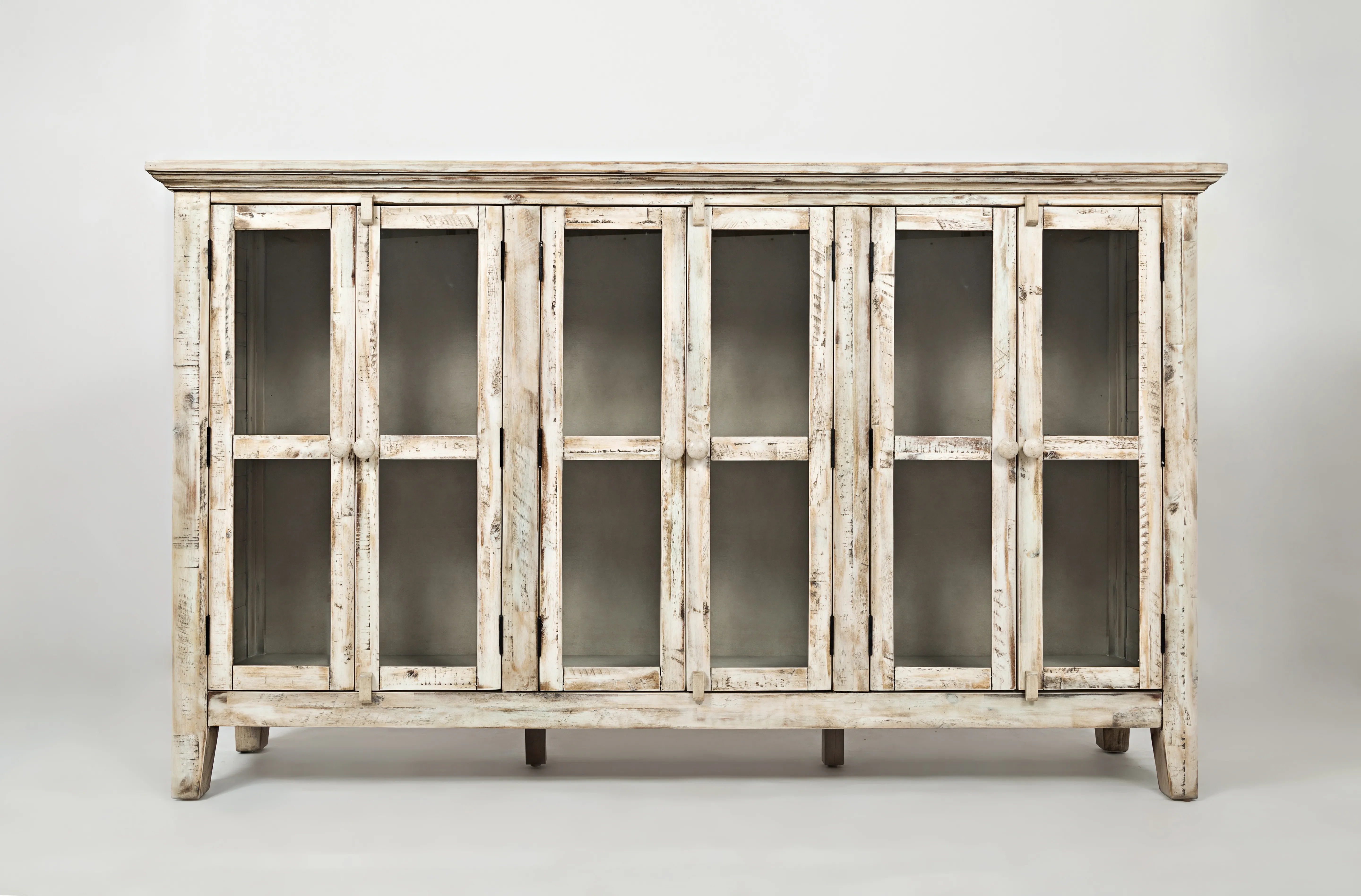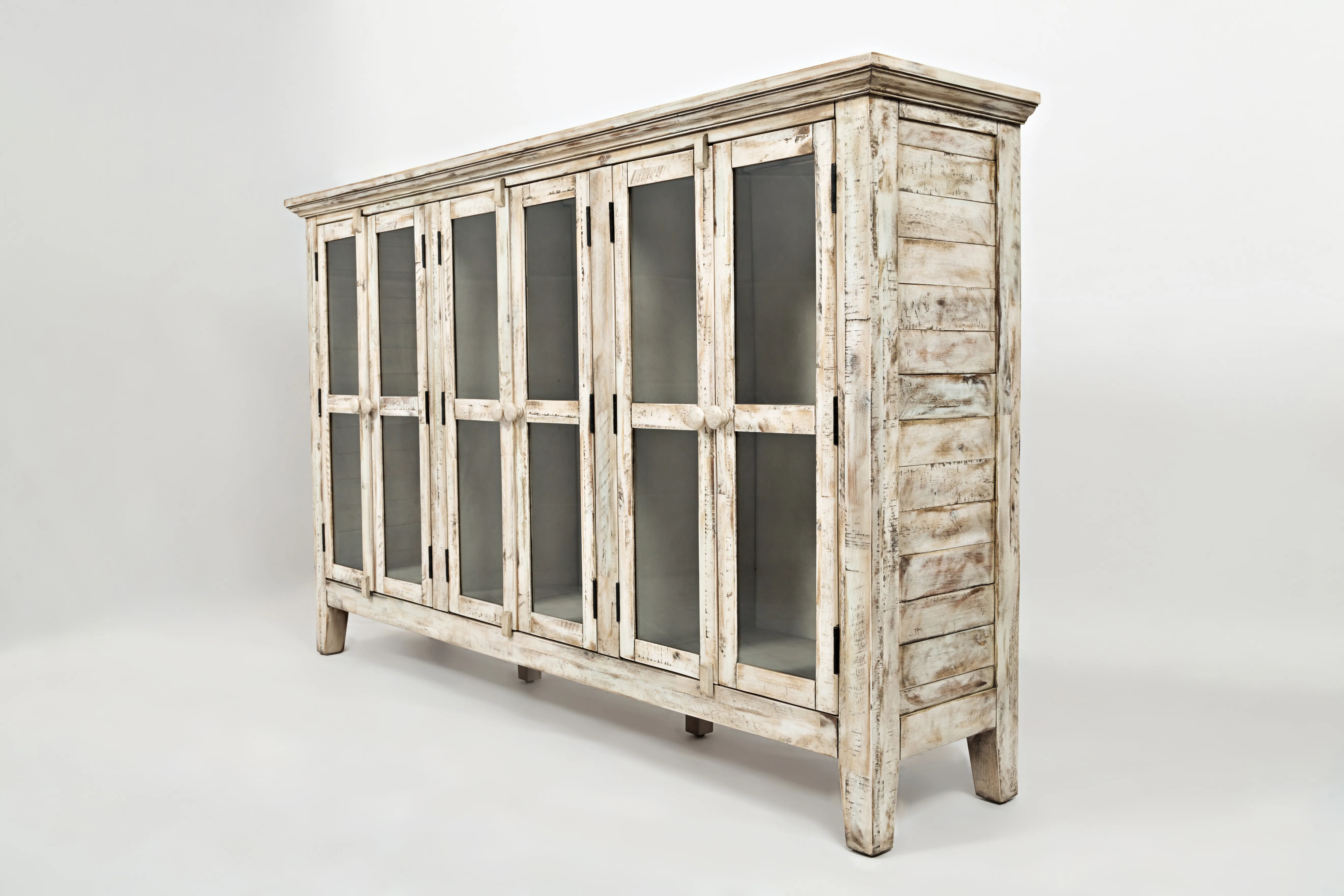 The relaxed coastal style of distressed hardwood Acacia provides the perfect rustic centerpiece for your home with this 70" Rustic Shores Accent Cabinet. The compact design has six doors with solid tempered glass and adjustable shelves, and the unique weathered finish is completely one-of-a-kind.