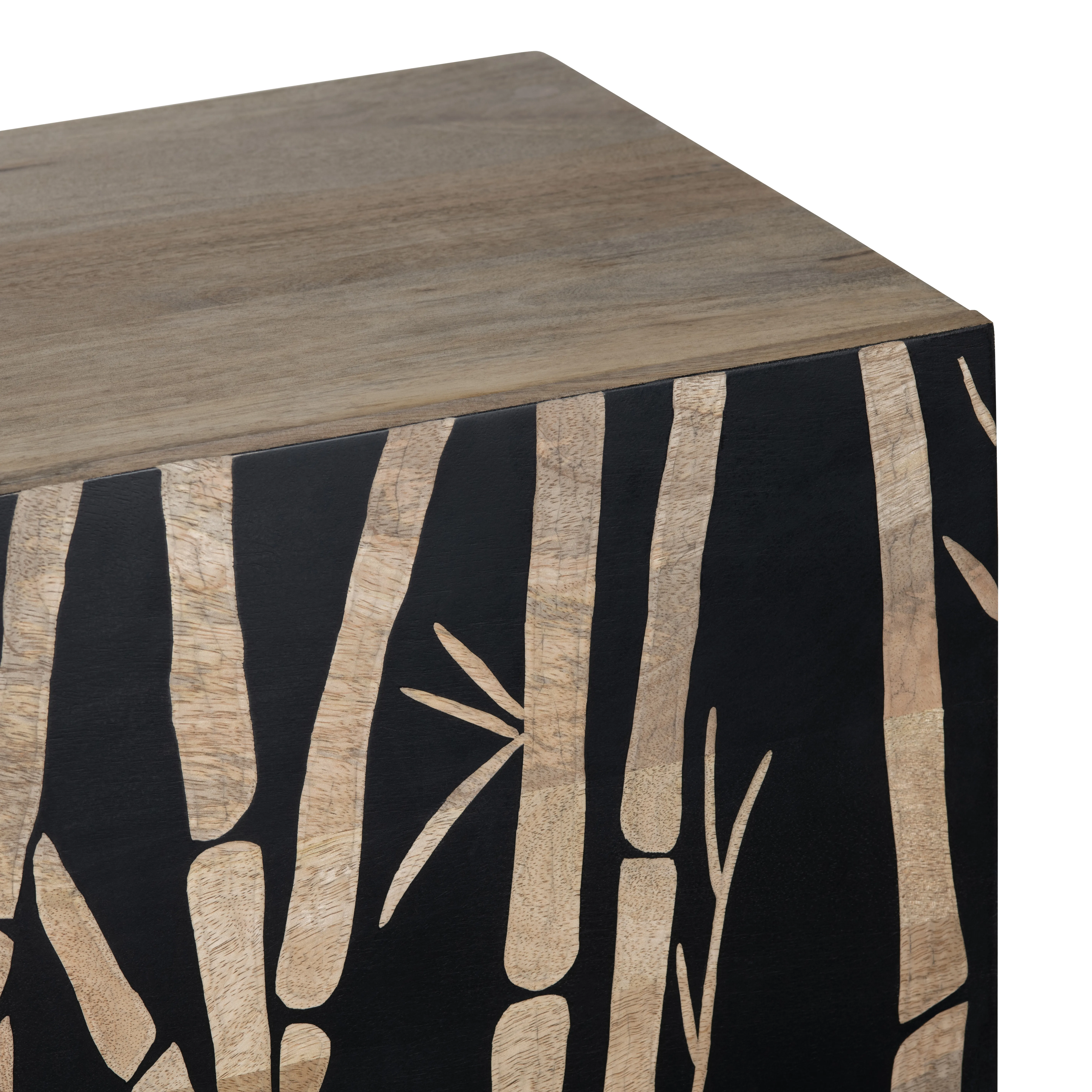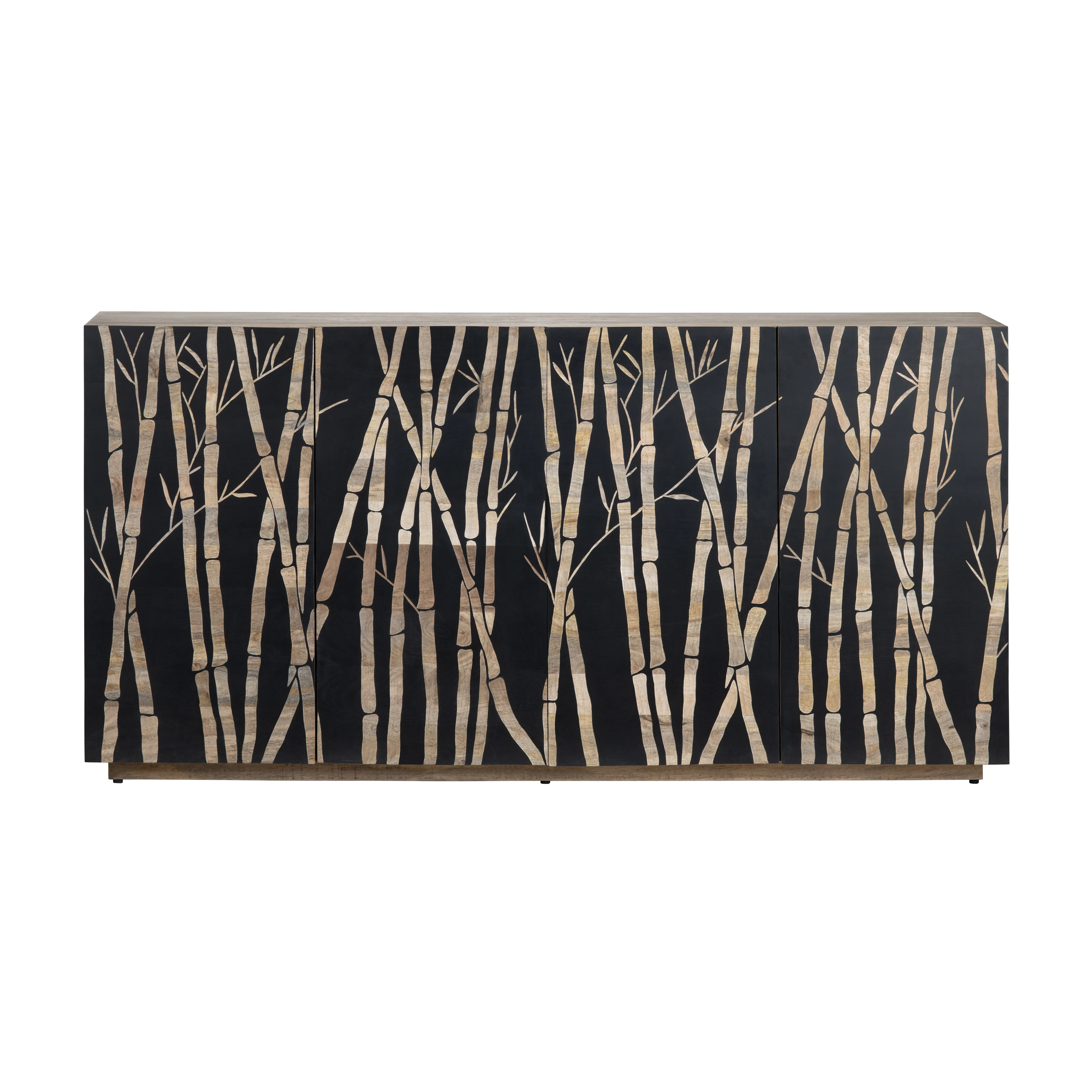 This striking cabinet, crafted from mango wood, features a bold black lacquer finish and showcases an exquisite bamboo-inspired design on its front doors, blending natural tones and textures for a stunning effect. Behind the four soft-close doors with European hinges are two removable shelves, offering customizable storage. Cord management holes add functionality, while floor levelers ensure stability. A perfect blend of artistry and practicality, this cabinet is both a statement piece and a versatile organizer