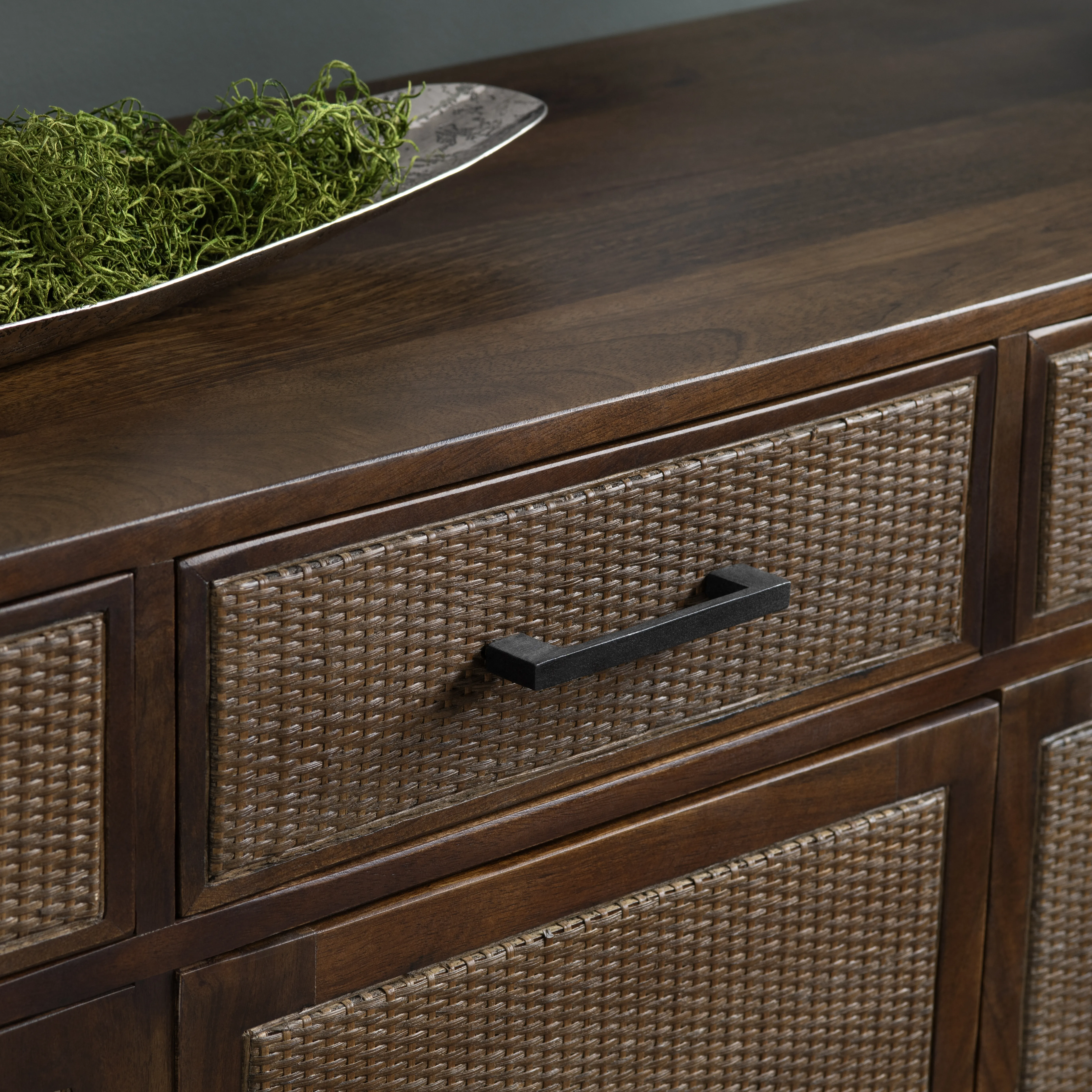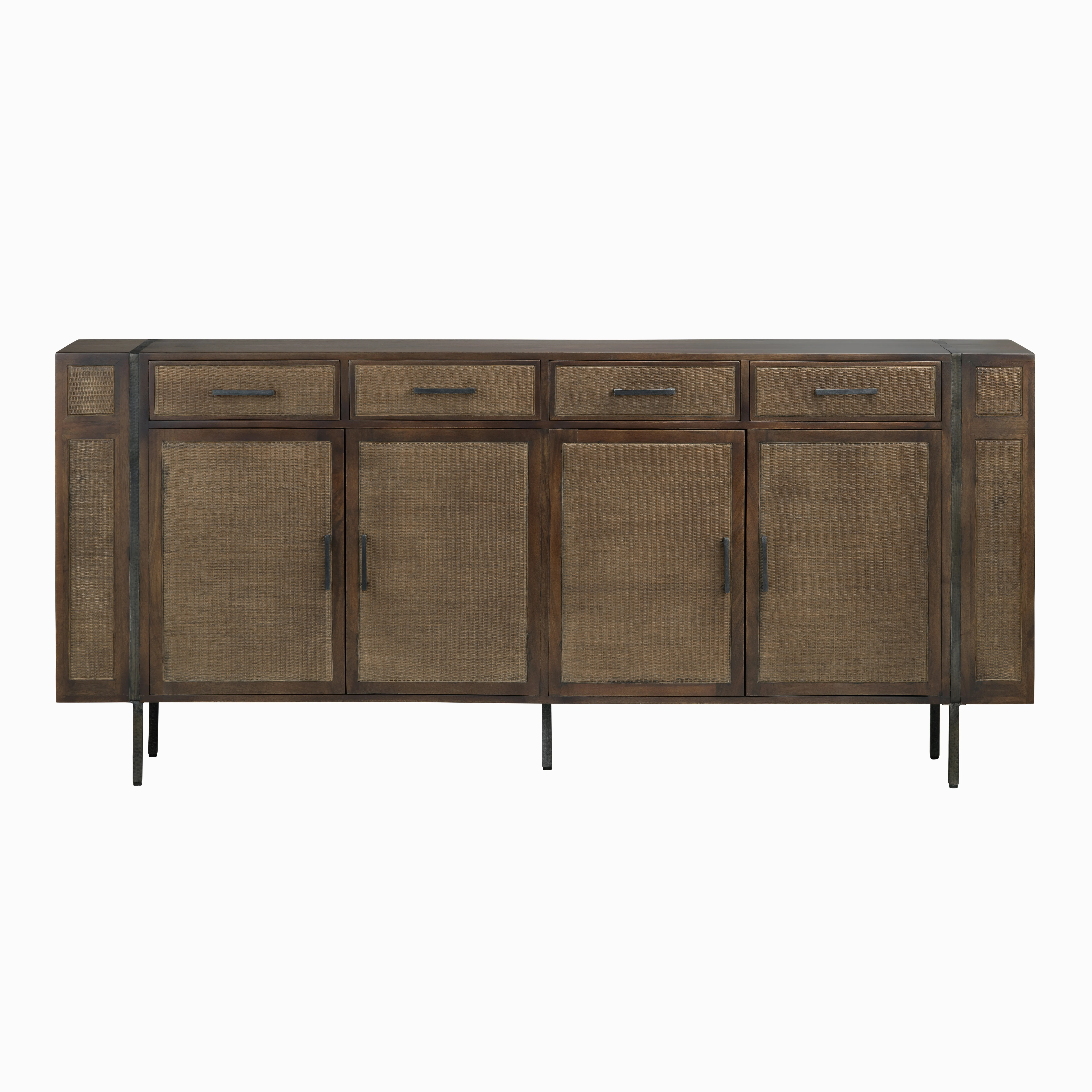 Crafted from rich mango wood with a warm brown stained finish, this media sideboard/credenza seamlessly blends natural textures with modern functionality. The rectangular frame is adorned with intricately woven cane panels, bringing depth and elegance to the design. Blackened iron details, including a hammered strap and slender legs, add an industrial edge. Four doors with upgraded European hinges open to reveal two fixed interior shelves, while four drawers provide extra storage. Two cord management holes allow for easy cable organization. Matte black-finished handles complete the refined look, and floor levelers ensure stability on any surface