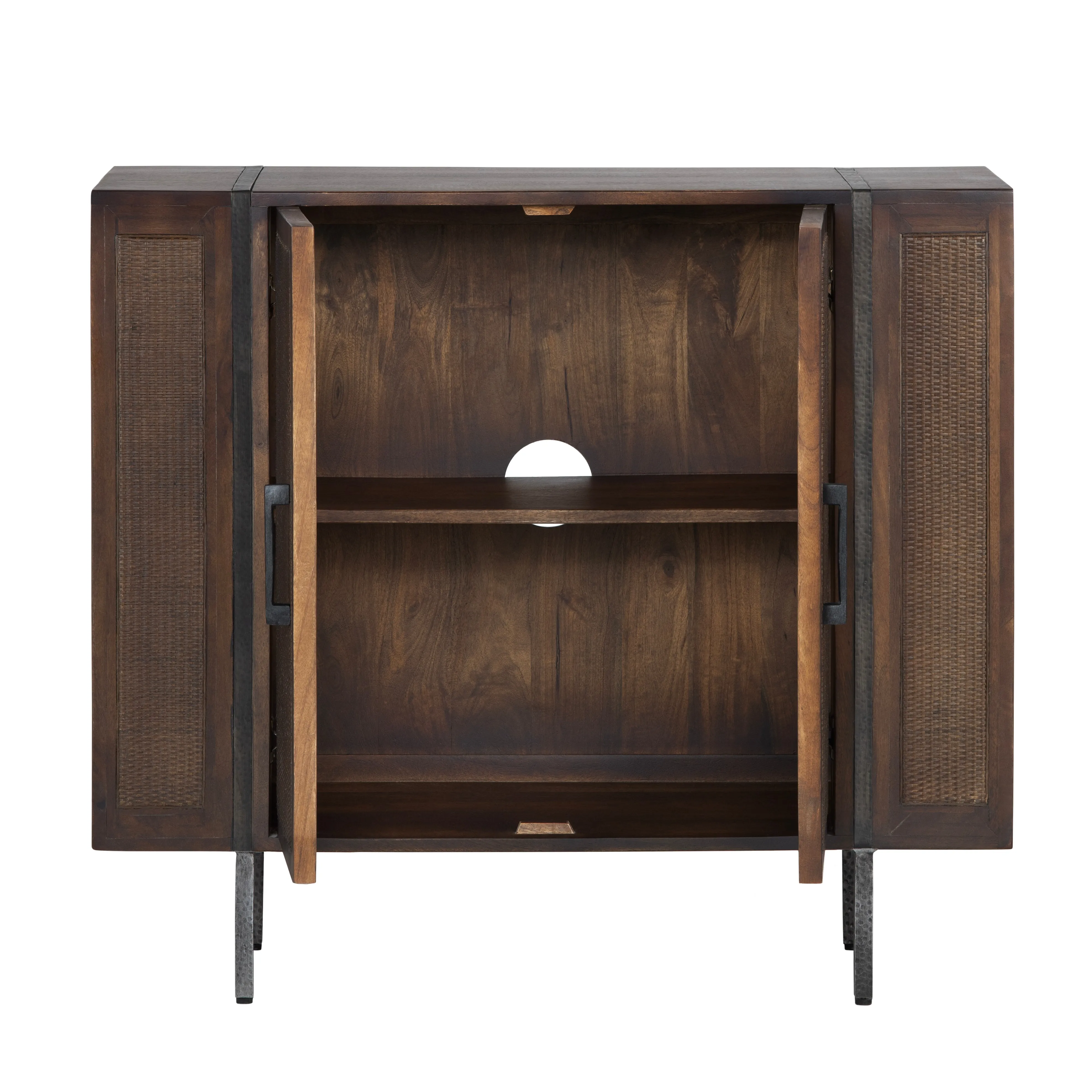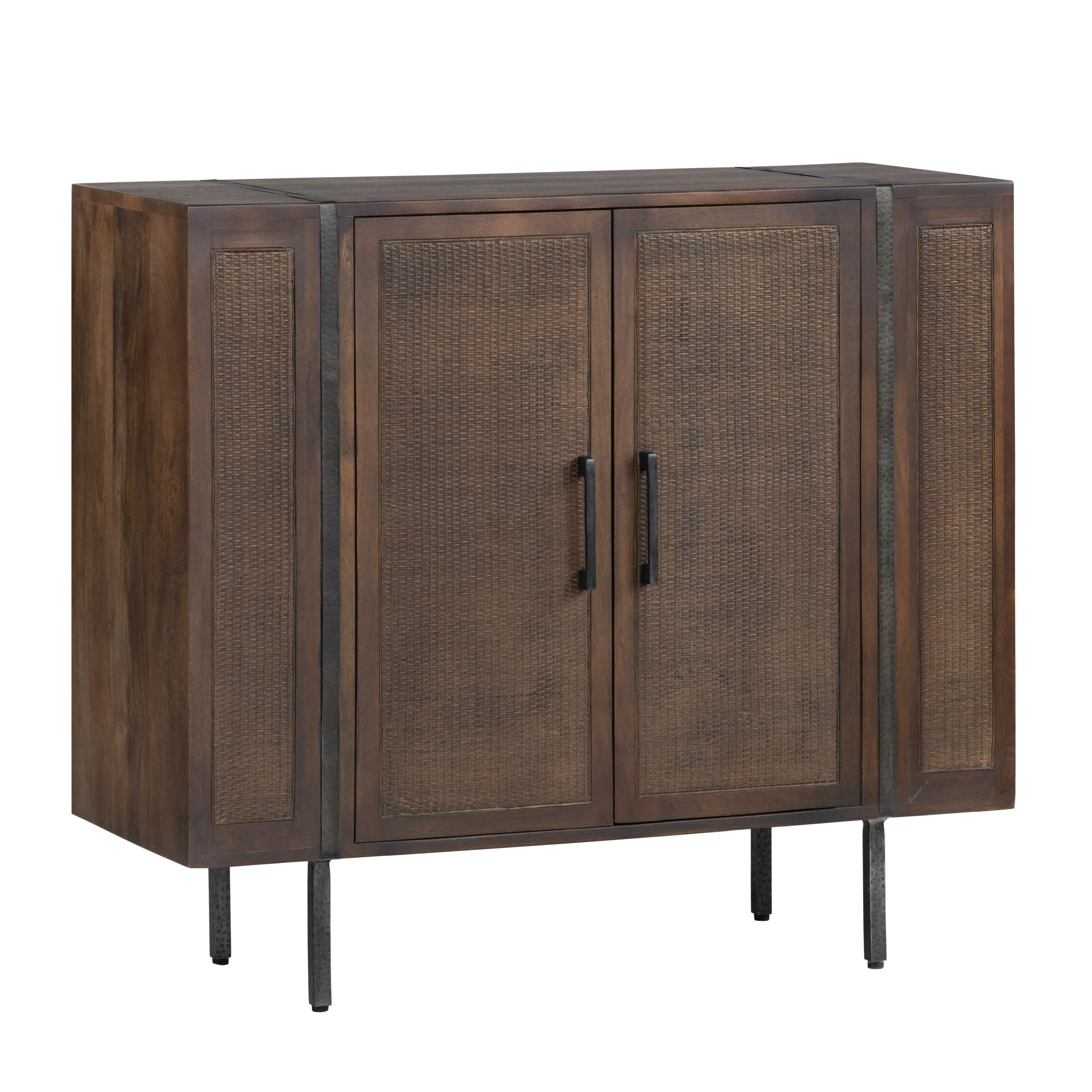Crafted from rich mango wood with a warm brown stained finish, this cabinet blends natural textures with modern functionality. The rectangular frame is accented by intricately woven cane panels, adding depth and elegance. Iron details, including a hammered strap and slender legs, provide a refined industrial touch. Featuring two doors with European hinges, a fixed interior shelf, and a cord management hole, this cabinet offers stylish storage. Floor levelers ensure stability on any surface