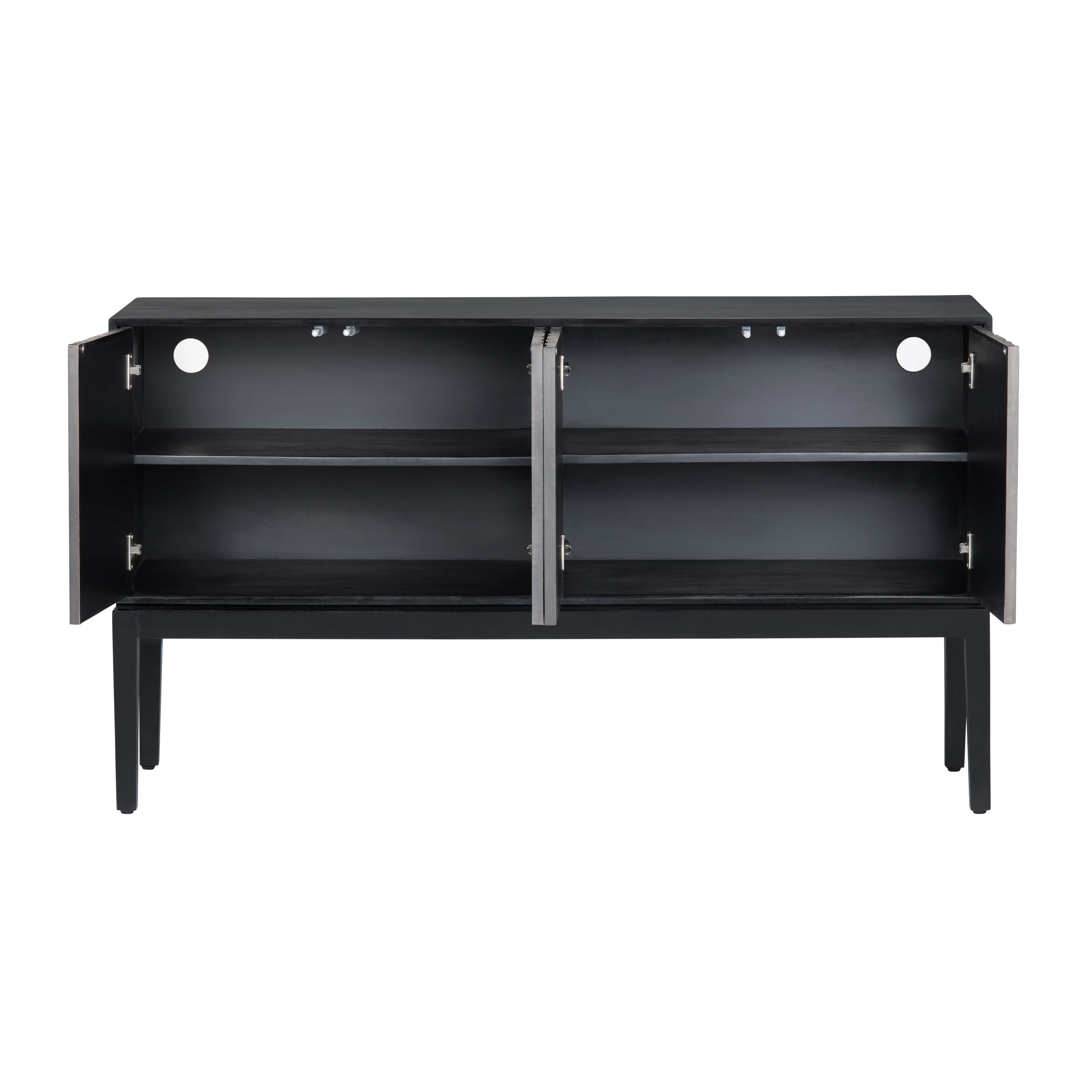 Make a bold statement with this striking media credenza, crafted from mango wood and finished in sleek black. Its rectangular design features four intricately sculpted doors with a dynamic, wave-like texture. Inside, two spacious compartments house fixed shelves for ample storage, while cord management holes keep cables tidy. Push-magnet closures and upgraded European hinges offer smooth functionality. Easy assembly—simply add the feet for a modern and artistic touch