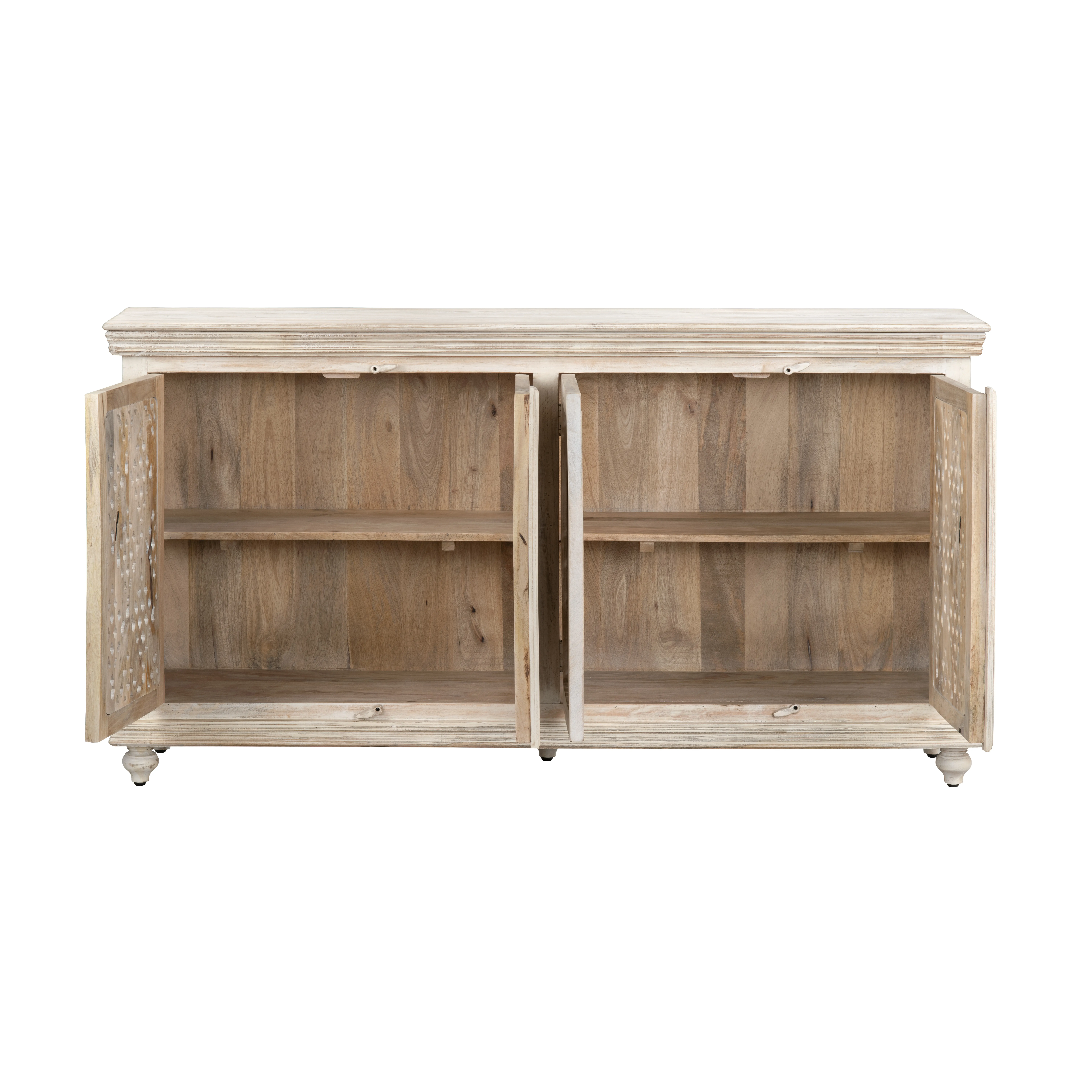 This beautifully designed medi sideboard, made from durable mango wood, features a charming whitewash finish that enhances its intricate hand-carved floral lattice doors. Behind the four doors, you’ll find two removable interior shelves, offering flexible storage solutions. Thoughtfully designed with cord management holes and sturdy floor levelers, it’s as practical as it is stylish. Matte black drop ring handles add a bold accent, making this sideboard a functional yet eye-catching piece for your space