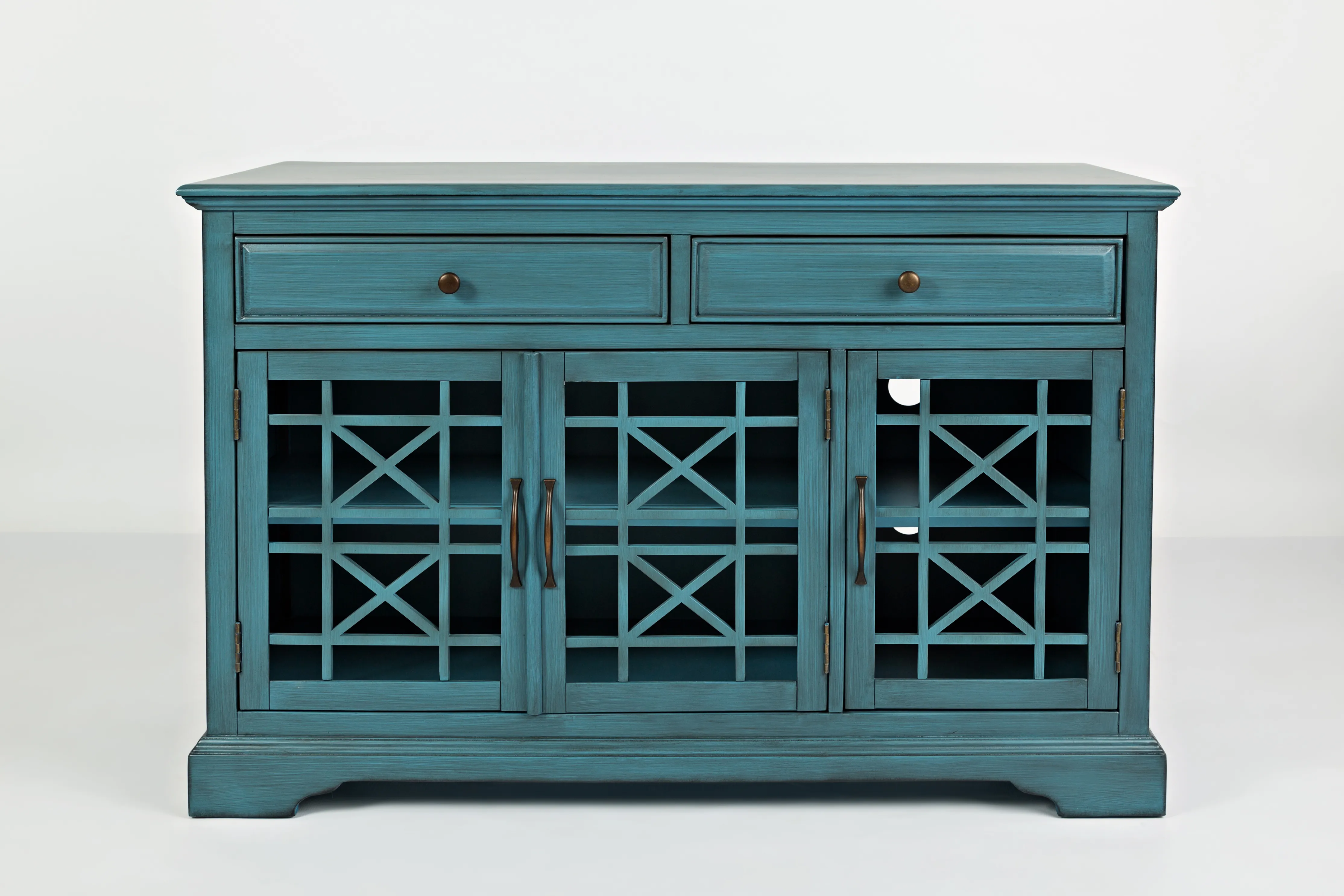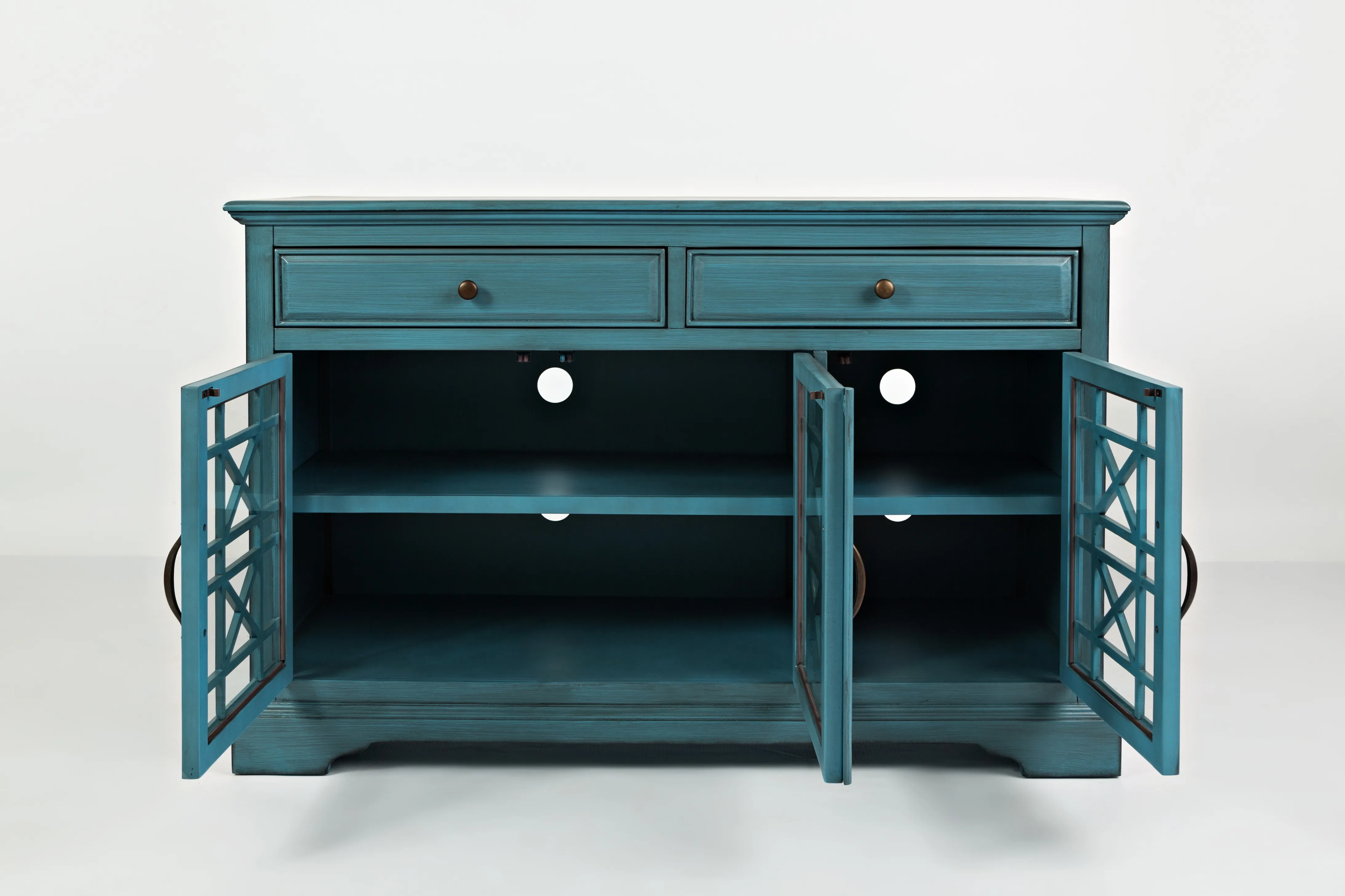 Our 50" cabinet combines beauty with functionality. Use as a TV stand or accent cabinet to complete any room. Two drawers and two cabinets provide plenty of storage for media accessories or other treasures. Crafted from solid and manufactured wood and available in 5 colors, this cabinet will become a centerpiece in any room.