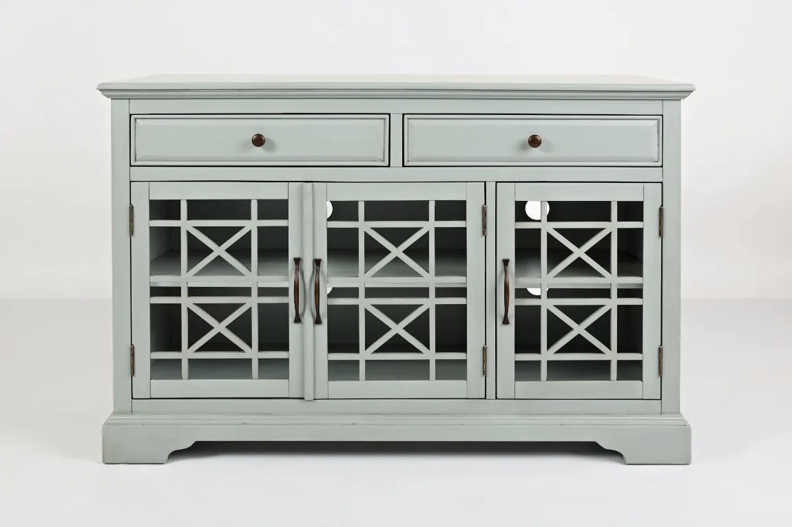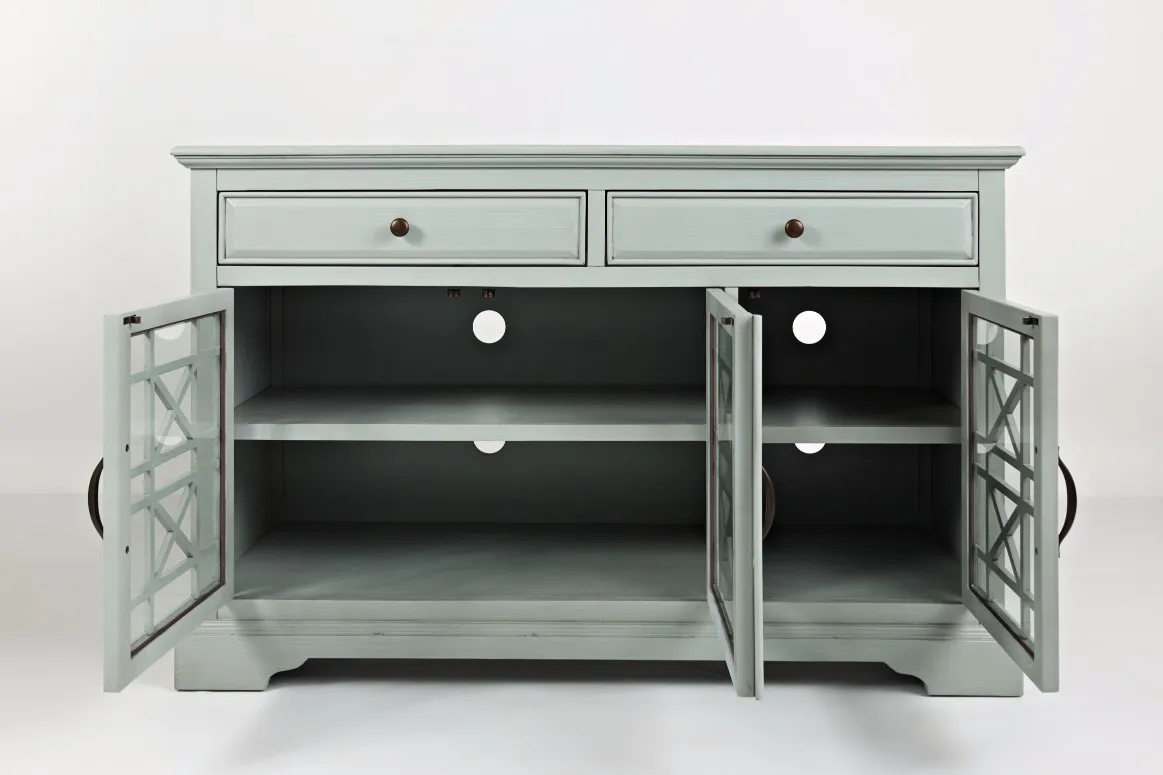 Our 50" cabinet combines beauty with functionality. Use as a TV stand or accent cabinet to complete any room. Two drawers and two cabinets provide plenty of storage for media accessories or other treasures. Crafted from solid and manufactured wood and available in 5 colors, this cabinet will become a centerpiece in any room.